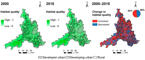 The changes in the habitat quality index in Foshan from 2000 to 2018 are shown in Figure 11. The results show a trend of degraded habitat quality, especially in developing and developed urban areas. Areas with higher habitat quality indices were mainly found in the southwest of the study area. The lower value areas were distributed to the east, gradually expanding to the northwest during the study period. The habitat quality index apparently declined by 17.79% in developed urban areas and 21.63% in developing urban areas. However, the habitat quality in rural areas increased by 0.14% (Table 4). Areas with decreased habitat quality accounted for 48% of the total area.