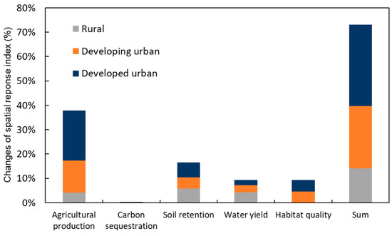 In areas with different urbanization levels, the spatial response index differed for different ES (Figure 12). The sum of spatial response for the total ES in rural, developing, and developed areas was 14.15%, 22.50%, and 33.44%, respectively. The spatial response index of agricultural production was 4.05% in rural areas, 13.21% in developing urban areas, and 20.53% in developed urban areas. The spatial response of carbon sequestration in developing areas was higher than that in developed and rural areas. The spatial response of water yield changes was 4.24% in rural areas, 2.95% in developing urban areas, and 2.16% in developed urban areas. The highest soil retention spatial response was observed in rural areas (6.02%). The spatial response index of habitat quality was 0.09% in rural areas, 4.50% in developing urban areas, and 4.69% in developed urban areas.