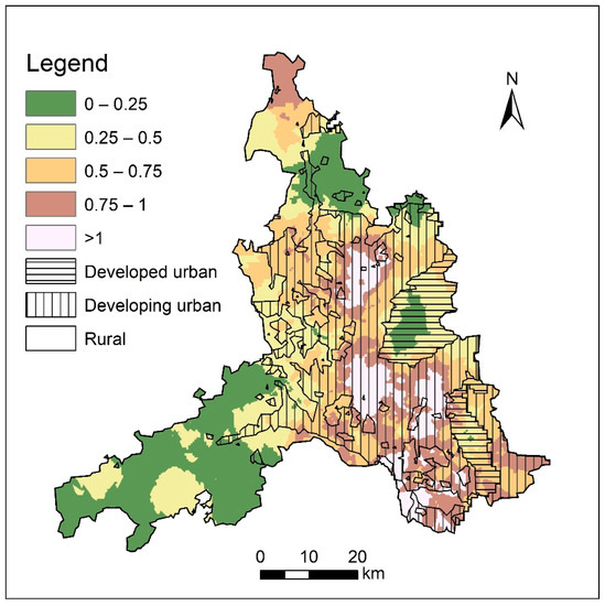 The spatial distribution of spatial response index derived from the total ES with respect to LULC is shown in Figure 13. The areas with higher values were more consistent with the distribution of water bodies. Four high-value accumulated areas were mainly distributed in the developing urban area. The spatial response index of the rural areas was lower. The average spatial response index in rural, developing, and developed urban areas was 0.39, 0.71, and 0.45, respectively.