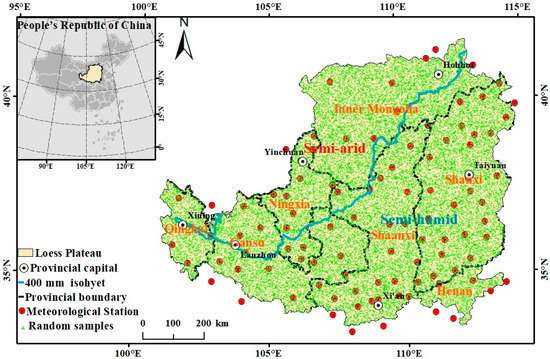 The study area was divided into semi-arid and semi-humid areas using the 400 mm isohyet (calculated using the annual mean precipitation data for the LP during 2000–2015) to carry out the comparative analysis. It should be noted that the 400 mm isohyet is of great significance to the physical geography and socio-economic regionalization in China, and it coincides with the Huhuanyong Line. In addition to dividing the climatic zones, this line divides the forest vegetation from the grassland vegetation and the densely populated area from the sparsely populated area [31,32].
