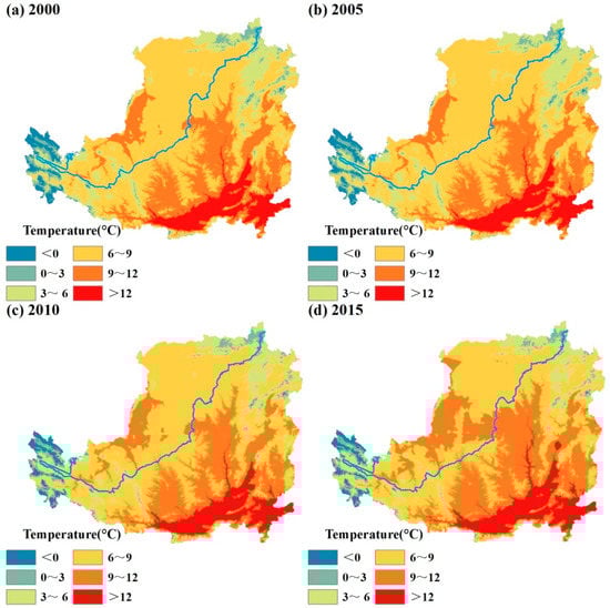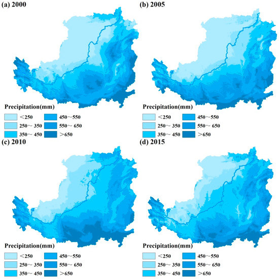 (3) Meteorological data: The monthly mean precipitation and temperature from 101 meteorological stations on the LP and in its surrounding areas during 2000–2015 were collected for use, which were downloaded from the China Meteorological Data Service Center (available from http://data.cma.cn/site/index.html, accessed on 27 October 2021). The annual value of the data from each meteorological station was calculated. Moreover, ANUSPLIN v4.3 was used to perform spatial interpolation of the meteorological station data, which were divided into 6 intervals using the equal interval method. Therefore, annual precipitation and temperature grid data (Figure 3 and Figure 4) with the same projection mode, spatial resolution, and time series as the NDVI data were obtained. It should be noted that ANUSPLIN is a widely used software application for spatial interpolation, which was developed on the basis of the thin plate smoothing splines theory. The main feature of ANUSPLIN is that the topographic information can be used in the spatial interpolation of the meteorological data [35].