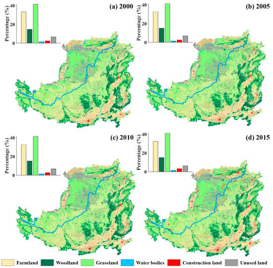 The land-use type on the LP during 2000–2015 is shown in Figure 8, and the grid scale area transfer matrix is shown in Table 4. In 2000, over the entire LP, the proportions of the farmland, woodland, grassland, water bodies, construction land, and unused land were 33.3, 14.7, 41.5, 1.4, 2.5 and 6.7%, respectively; in the semi-arid area, they were 7.1, 1.2, 16.6, 0.7, 0.8 and 5.3%, respectively; and in the semi-humid area, they were 26.2, 13.5, 24.9, 0.8%, 1.7 and 1.4%, respectively. In 2015, over the entire LP, the proportions of farmland, woodland, grassland, water bodies, construction land, and unused land were 32.4, 15.1, 41.2, 1.5, 3.3 and 6.6%, respectively; in the semi-arid area, they were 6.9, 1.3, 16.4, 0.7, 1.1 and 5.2%, respectively; and in the semi-humid area, they were 25.4, 13.8, 24.8, 0.8, 2.1 and 1.4%, respectively. Overall, the area of the change in land-use types on the LP was not significant, and it was mainly in the 0.94% decrease in farmland, the 0.44% increase in woodland, and the 0.82% increase in construction land. To a certain extent, these changes reflect the impacts of human activities in the study area, such as the implementation of the GGP and urbanization-related development.