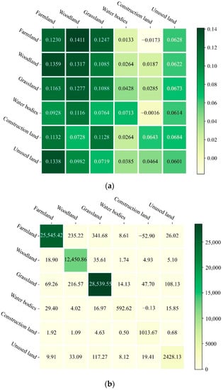 (9) Land-use type data: These data were downloaded from the RESDC. The spatial resolution is 1 km × 1 km. There are 6 land-use types, including unused land, construction land, water bodies, grassland, woodland, and farmland (Figure 8), with a total of 36 transfer combinations.