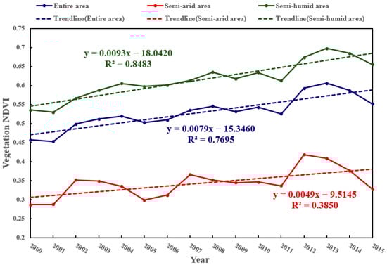 The temporal changes in the NDVI on the regional scale on the LP during 2000–2015 are shown in Figure 11. The NDVI on the LP exhibited a fluctuating upward trend. The annual NDVI growth rates of the entire LP, the semi-arid area, and the semi-humid area were 0.0079, 0.0049, and 0.0093, respectively, indicating that the growth rate of the NDVI in the semi-humid area was higher than in the semi-arid area after the GGP was implemented.