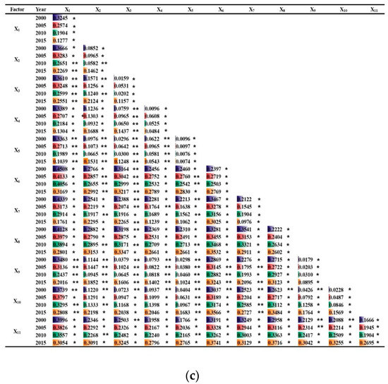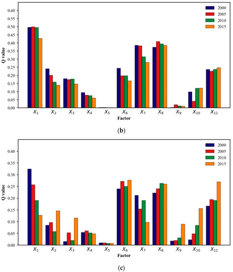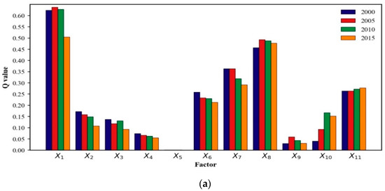 Using the typical annual values of 2000, 2005, 2010, and 2015 to drive the factor detector, the individual effects of the factors (represented by the q value) could be obtained, as shown in Figure 12.