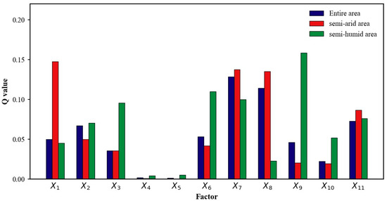 For the semi-humid area, the order of the q values was GDP density (q = 0.1583) > geomorphic type (q = 0.1101) > soil type (q = 0.0999) > altitude (q = 0.0955) > land-use type (q = 0.0761) > temperature (q = 0.0705) > population density (q = 0.0520) > precipitation (q = 0.0452) > vegetation type (q = 0.0227) > slope aspect (q = 0.0049) > slope (q = 0.0040).
