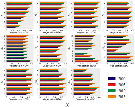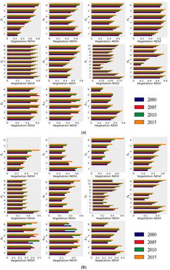 Using the typical annual values for 2000, 2005, 2010, and 2015 to drive the risk detector, the ranges or the types of factors for the NDVI could be obtained, as shown in Figure 16. The ranges or the types of factors for the NDVI were different in different years in the entire LP, and in the semi-arid/humid areas.