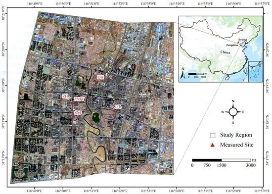 In this paper, the central region of Cangzhou was selected as the study area. Cangzhou is located in the southeast of Hebei Province, China, covering the coordinates of 38°16′–38°22′N, 116°48′–116°54′E. The research area covers about 64 km2 (Figure 1), and the terrain in this area is roughly flat. Most of the elevation is between 7.2 and 9.5 m, and the general trend of this terrain indicates a tilt from southwest to northeast. The study area is a warm temperate semihumid continental monsoon climate with four distinct seasons, large temperature differences, and large interannual variations in precipitation. The average annual precipitation in recent decades (1971–2020) was 560 mm, the maximum annual precipitation was 1064.8 mm (1977), while the minimum annual precipitation was 192.8 mm (1999). Precipitation was observed to be unevenly distributed during the year, mainly during the flood season, which accounts for about 80% of the annual precipitation.