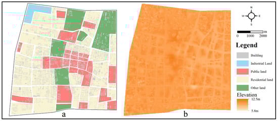 (a) Buildings extracted from GF-2 data and land-use type in the study area; (b) modified DEM based on buildings.