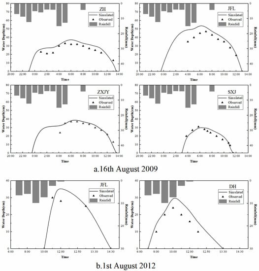 Observed and simulated water depths of the two historical rainfall events: (a) 16 August 2009; (b) 1 August 2012.