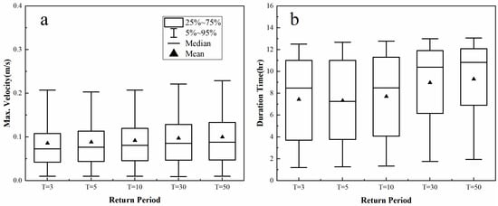 (a) Boxplots of the maximum velocities under different return periods; (b) boxplots of the duration time distribution of the inundation depths above 40 cm under different return periods.