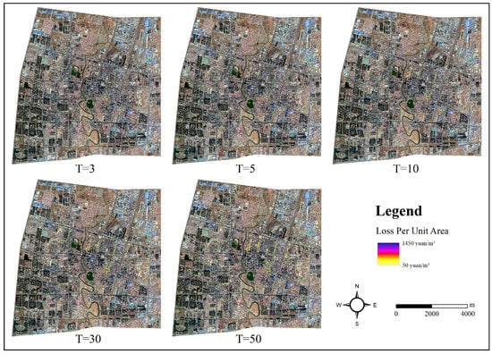 Using the construction information and the spatial distribution of the maximum inundation depths, ArcGIS was used for statistical analysis based on the damage curve (Formula (6)). The spatial distribution of the inundation loss per unit area was obtained under different return periods (Figure 10). Figure 10 shows that, for a 3-to-50-year return period, the area of damaged buildings, and the inundation loss per unit area, gradually increases, while the severely damaged area remains generally the same. The inundation loss per unit area for most of the damaged region is relatively low and will be statistically analyzed further.