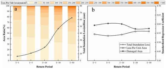 After standardizing the data, multivariate linear regression analysis was performed for the total loss, the loss per unit area, and the damaged area under different return periods, the results of which are provided in Table 5 and Figure 11b. The loss per unit area was calculated from the maximum inundation depth according to Formula (6). Therefore, this regression analysis reflects the influence of the inundation depth and damaged areas on the total loss as a whole. As shown in Figure 11b, in each of the return periods, the influence of the damaged area to loss was slightly greater than that of the inundation depth, but for the 30- and 50-year return periods, this gap was reduced. This result indicates that, with an increase in the return period, the influence of the inundation depth increased.