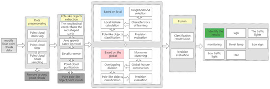 The vehicle-mounted lidar is a passive way of mobile scanning that can quickly and accurately obtain information on both sides of roads. However, owing to the different distances between the scanning target and the laser emission center, the different scanning viewpoints, and the mutual occlusion between the targets, the target point cloud density is different and point clouds may be missing, which brings challenges to the classification of the target point cloud. Therefore, this paper proposes a strategy that combines voxel segmentation and voxel growth to extract pole-like objects. Then, we used the method of fusion of local feature and global feature classification results to identify different pole-like objects. The experimental results indicated that the method can quickly extract and accurately identify the pole-like objects of the road scene point clouds. The technical route of the method is shown in Figure 1 below.