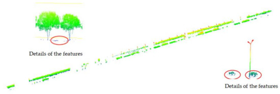 The idea central to this method is that the voxel of each vertical column is taken as the research object, and one of the double codes encodes from the lowest voxel to the highest. In the other coding process, the voxel in which the point clouds appear is used as the initial voxel, and while the voxel contains point clouds, it will be encoded continuously. The above-mentioned unretained point cloud data are retained by using the feature of the difference between the double codes, as the difference in the details of the pole-like objects is obvious. Meanwhile, for low-rise vegetation, the two codes are close to each other, so low-rise vegetation can also be filtered out. The pole-like object point clouds after these two steps are shown in Figure 6.