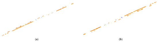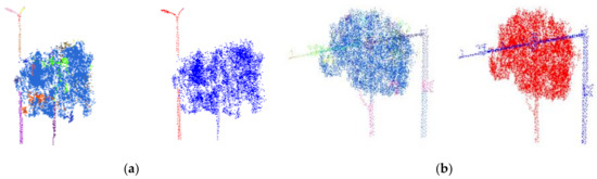 Figure 6 shows that there are still some noise points among the extracted pole-like objects, which are caused by the improper scale of the voxel and unsatisfactory detail expression. Therefore, the retained pole-like objects tend to be retained together when the surrounding objects are adhered to. Another major reason is that the height of some low vegetation is high, and the low-rise vegetation is also retained as rod-shaped parts in the vertical continuity search.