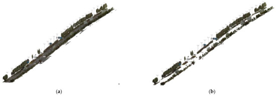 The Alpha3D vehicle-mounted mobile measurement system was used to collect the data of an urban road. The horizontal accuracy of the system is <0.030 m RMS, and the vertical accuracy is <0.025 m RMS. The laser point frequency of the system can reach 1,000,000 points/s, the measurement accuracy can reach 5 mm, and the repeated measurement accuracy can reach 2 mm. The point cloud data of the road scene obtained are shown in Figure 2. A total of 1-km long street view experimental data were collected, with a size total of 1.5 GB and 60,244,135 points, including natural pole-like objects, artificial pole-like objects, vehicles, and low vegetation.