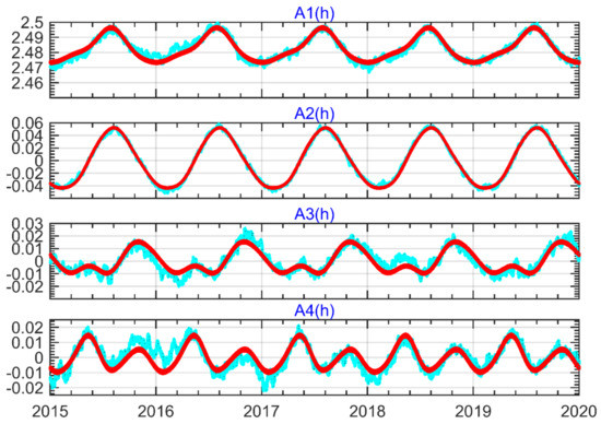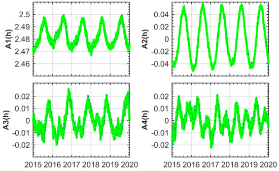 Figure 1 shows the time series of the first four orders coefficient Ai(h). As such, coefficient Ai(h) reflects the average variation in the tropospheric SH coefficients. The chart shows that coefficient Ai(h) exhibits obvious annual and semiannual cycles, and coefficients A3(h) and A4(h) also exhibit obvious quarterly variations. Through high-precision modeling of coefficient Ai(h), the SH coefficient is accurately inverted, and the high-precision tropospheric delay can then be obtained quickly and efficiently.