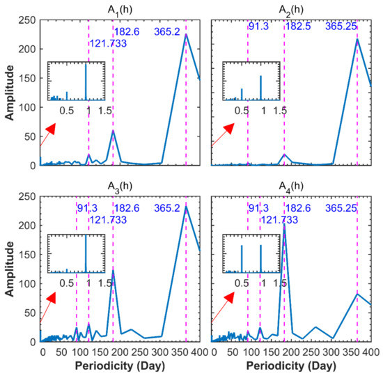 Cooley and Tukey [31] proposed fast Fourier transform (FFT), which is usually used to analyze linear systems and identify frequency components. To accurately detect the period of correlation coefficient Ai(h), we performed the FFT analysis of the first four orders coefficient Ai(h) from 2015 to 2019 and focused on certain positions to obtain more details, as shown in Figure 2. The chart reveals that Ai(h) is dominated by both annual, semiannual, diurnal, and semidiurnal variations. In addition, A1(h) exhibits certain 1/3-year variation, A2(h) experiences certain 1/4-year variation, and A3(h) and A4(h) reveal certain 1/3-year and1/4-year variations.