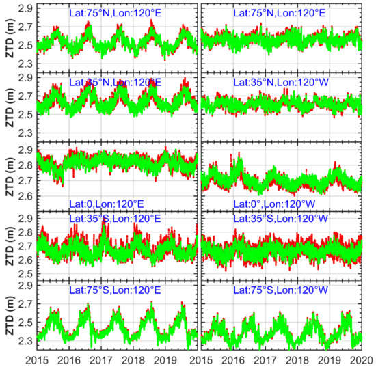 More detailed verification of the SH_set products is conducted from the perspective of time. Figure 4 shows the time series diagram of the ZTD at the different latitudes solved by ERA-5 and the SH_set. The chart shows that although there exist significant differences in the tropospheric delay between the different latitudes, the tropospheric delay values calculated by the SH_set reflect the periodic changes and are in good agreement with those of the ERA-5 ZTD, which further verifies that the spherical harmonic coefficient model achieves a good adaptability.