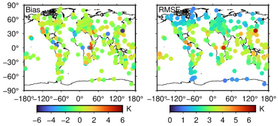 To assess the performance of the SH_set and EOF-based model EGtrop, we compared the set and model results with the ZTD derived from the IGS stations and radiosonde data. The mean Bias and root mean square error (RMSE) are adopted as accuracy indicators of the model or data quality. The calculation equation is as follows: