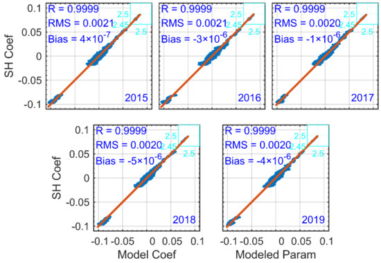 Scatter plots of observational data versus modeled values of SH coefficients for the period 2015−2019. The blue-green box shows the first spherical harmonic coefficient. The correlation coefficient (R), RMSE (RMS) and Bias (Mean) are also shown in the panels.