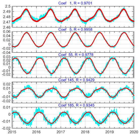 Time series of SH coefficients between EGtrop and SH_set for the period 2015−2019. Cyan spots represent SH coefficients provide by SH_set, and red spots represent SH coefficients derived by EGtrop.