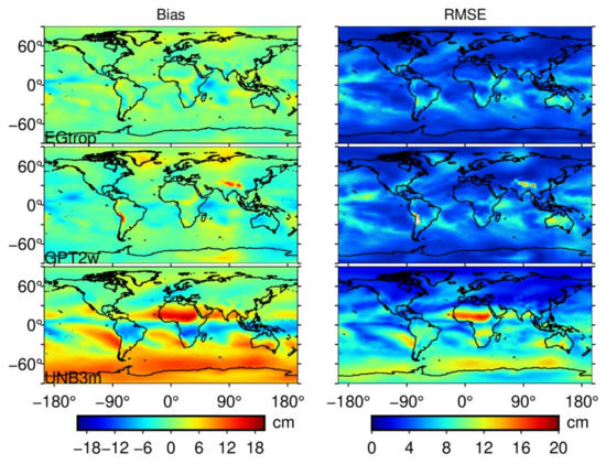 Figure 8 shows the global distribution of the annual average Bias and average RMSE of each model based on the global ERA-5 ZTD in 2020. As shown, the overall Bias of the EGtrop model is small, and the Bias value in most areas is 2 cm, which is closer to the reference value than are the GPT2w and UNB3m models.