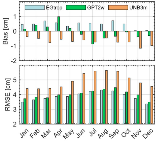 To validate the performance of the above models in different seasons, we statistically analyzed the monthly average results of the three models at global radiosonde stations. Figure 9 shows the monthly average Bias and RMSE of ZTD estimates between the models and radiosonde. As shown in the figure, EGtrop performs best with smaller absolute deviation and RMSE in different months when compared with other models. In terms of Bias for all months, the absolute average Bias of the three models in all months is within 1 cm, and the stability of the EGtrop model is better. The deviation of the EGtrop model in all months is positive, and the deviation of UNB3m is negative. In terms of RMSE for all seasons, the EGtrop model shows 0.16–2.5 cm and 6.52–13.84 cm improvements over the GPT2w and UNB3m models, respectively. Therefore, the performance of the EGtrop model is better than that of other models in different seasons. In addition, the RMSE of EGtrop, GPT2w, and UNB3m has obvious seasonal variations, and the accuracy in summer is usually lower than that in other seasons. This is because the water vapor content over the station changes sharply in summer, which leads to poor estimation results from the empirical model.