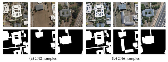 The samples of the WHU dataset and its corresponding label. (a) are samples of 2012; (b) are samples of 2016.
