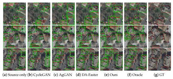 Table 4 displays the results on the cross data source and cross-region adaptation task. As shown in the table, we achieved 47.29% of the mAP on this domain adaptation task, achieving the best results. Specifically, compared with the Source-only model, we achieved a significant gain increase of +18.15%. Among all GAN-based domain adaptation methods, our mAP is +26.13% better than CycleGAN and +16.23% better than AgGAN. Compared with the domain adaptation methods DA-Faster* and DA-Faster based on adversarial training, our method improves 13.51% and 2.4%, respectively. This result implies that the domain alignment performance at the image-level is not good. In addition, we can also see in the visualization results in Figure 10 that our method has achieved the best results. It is worth noting that comparing scenario 2 (Inria (Chicago) → Inria (Austin)) and scenario 3 (WHU 2012 → Inria (Austin)), the AP of Table 4 is not as high as that shown in Table 3 due to the huge discrepancy between the domains of scenario 3. These results show that our method can effectively improve the domain shift caused by different data acquisition methods, resolution, scale, regional differences, and other problems. From the ablation experiment in Table 4, it can be seen that the prototype-level alignment (pro) and rotation-invariant regularizer (inv) modules can effectively improve the overall performance of cross-domain object detection, and have an AP improvement of 13.23% and 12.69%, respectively, compared to Source-only.