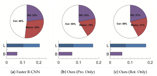 The results are shown in Figure 11. From the figure, we can observe that each component (prototype-level alignment or rotation-invariant regularizer) increases the number of correct detections (white color), and significantly reduces the number of false positives (other colors). In addition, we have also observed that the model using rotation-invariant regularizer (Rot. Only) produces higher mislocalization errors than the model using prototype-level alignment (Pro. Only). The reason may be that prototype-level alignment aggregates features captured by RoI more directly, resulting in better alignment. As you can see from the bar chart below, our approach reduces location errors and background errors and turns false positives into true positives.