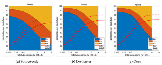 We continue the error analysis of the adaptation case on Inria (Chicago) → Inria (Austin). Figure 12 shows the error analysis in the Austin test set. Comparing the baseline Source-only with the DA-Faster, we observe that domain adaptation improves the detection performance. Comparing DA-Faster and our proposed method, we observe that our method slightly reduces localization errors and background errors.