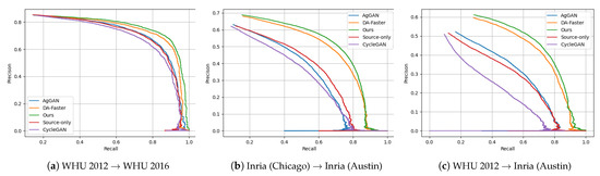 P–R curves of three different domain adaptation scenarios. The different colored curves in the figure represent different cross-domain adaptation methods.