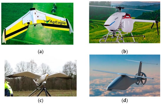 Examples of typical UAVs: (a) A fixed-wing UAV “AgEagle RX60” from AgEagle (https://ageagle.com/agriculture/# (accessed on 17 October 2021)); (b) An unmanned helicopter “Shuixing No.1” from Hanhe (http://www.hanhe-aviation.com/products2.html (accessed on 17 October 2021)); (c) A flapping-wing UAV from the Drone Bird Company “AVES Series” (https://www.thedronebird.com/aves/ (accessed on 17 October 2021)); (d) A hybrid UAV “Linglong” from Northwestern Polytechnical University (https://wurenji.nwpu.edu.cn/cpyf/cpjj1/xzjyfj_ll_.htm (accessed on 17 October 2021)).