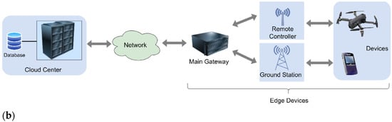 Cloud computing paradigm and edge computing paradigm for UAV RS. (a) Cloud computing paradigm; (b) Edge computing paradigm.