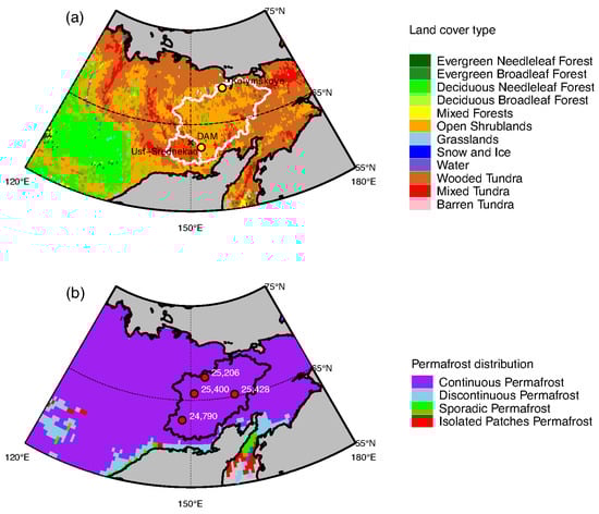 Maps of geographical characteristics in the Kolyma River basin: (a) Vegetation (the 1° GLDAS-2/NOAH Dominant Vegetation Type datasets (https://ldas.gsfc.nasa.gov/gldas/GLDASvegetation.php accessed on 30 July 2021) using the NOAHv3.3 Vegetation Dataset from GLDAS-2) and (b) Permafrost distribution []. White and black lines denote the Kolyma River watershed boundary (total basin). Red area in (a) shows a sub-basin “Dam basin.” In (a), yellow circles denote the locations of river discharge cross-sections, and black cross-mark denotes a large reservoir. In (b), red circles and white numbers denote meteorological observation sites, which include soil temperature profile observation at 20 cm, 40 cm, 80 cm, 160 cm, and 320 cm depth.