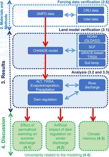 Analysis flow in this study. The vertical axis denotes the Materials and Methods, Results, and Discussion. The number in the parentheses denotes the corresponding section. The abbreviations in the figure are as follows: GMFD: Global Meteorological Forcing Dataset for land surface modeling [], CRU: University of East Anglia Climatic Research Unit [], Udel: University of Delaware Air Temperature & Precipitation [], CHANGE: A coupled hydrological and biogeochemical model [], Global land data assimilation system v2.0 (NOAH) [], SCF: Snow cover fraction [], TWSA: Terrestrial water storage anomaly [], ALT: Active layer thickness [].