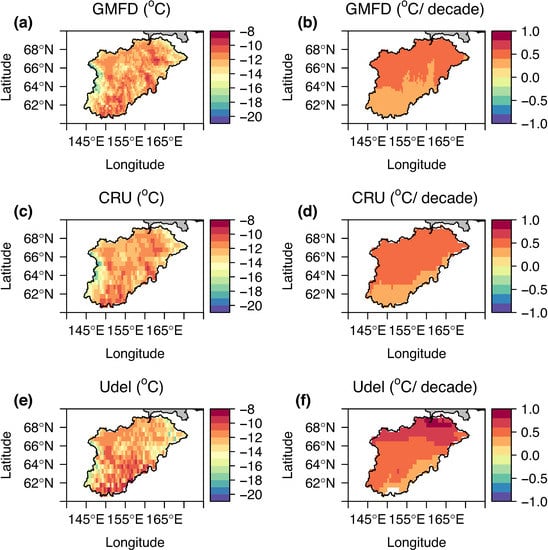 To confirm the reliability of the GMFD forcing data, we compared it against two similar global datasets: CRU and Udel. First, we determined the climatological air temperature data from the three datasets. Figure 3 shows the climatology and trend in annual mean Ta for the three different forcing datasets used in our study. Figure 3a,c,e show the climatology of the annual mean Ta by GMFD, CRU, and Udel, respectively, recorded during a 34-year period (1979–2012). The three datasets exhibited very similar spatial patterns and magnitudes. Figure 3b,d,f show linear trends in the annual Ta from 1979 to 2012. There were latitudinal gradients among all three trends; the northern part of the Kolyma River basin exhibited a greater warming trend than the southern part. The magnitude of the warming trend in the northern area was over 0.5 °C/decade, whereas the southern part exhibited a magnitude <0.2 °C/decade. The warming in the Udel datasets was stronger than the other two datasets; however, the regional warming trend in air temperature among the three datasets was very similar. Thus, Ta for the GMFD data was compatible with those of the other two datasets (CRU and Udel).