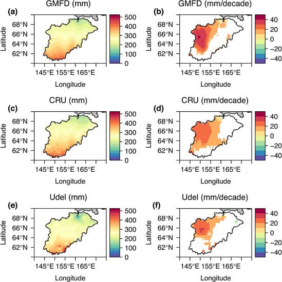 In addition to Ta, precipitation is important for determining the river discharge and hydrological cycle. Figure 4 shows the climatology and trend in the annual precipitation for the three different forcing datasets from 1979 to 2012. Figure 4a,c,e show the spatial variations in annual precipitation for the 34-year period obtained from the GMFD, CRU, and Udel datasets, respectively. All datasets exhibited very similar latitudinal gradients in terms of precipitation. Figure 4b,d,f show linear trends of annual precipitation from 1979 to 2012. There were longitudinal gradients among the trends of the three datasets; a higher increasing trend could be observed in the western part recording more than 10 mm/decade; however, the eastern part did not exhibit statistical significance. The spatial pattern of precipitation trends was similar among the three datasets. Notably, the magnitude of the increasing precipitation trend in the western area was more than 10 mm/decade. Although the increasing precipitation in the GMFD dataset was stronger than that in the other two datasets, the regional increasing trend of precipitation in all the three datasets was evidently similar. Thus, the annual precipitation in the GMFD data was compatible with those of the other two datasets (CRU and Udel).