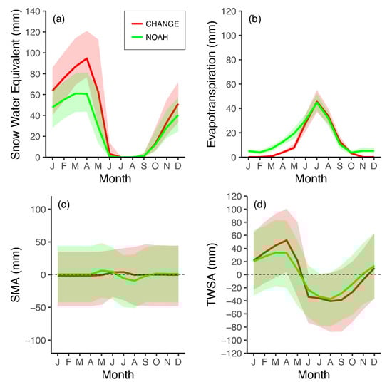 Seasonal variations in monthly climatology in hydrometeorological variables derived from CHANGE and NOAH model simulations from 1979 to 2012. The shaded area denotes the 95% confidence interval (CI): (a) Snow water equivalent, (b) Evapotranspiration, (c) soil moisture anomaly (SMA), and (d) terrestrial water storage anomaly (TWSA).