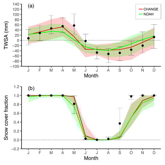 Comparison of estimated terrestrial water storage anomaly (TWSA) and snow cover fraction (SCF) using CHANGE and NOAH models. Black circles and error bars denote the GRACE-based observation datasets and their 95% confidence intervals (CIs), respectively. CHANGE is shown as a solid red line, with monthly climatology and 95% CIs presented in shades of red, whereas NOAH is shown as a solid green line, with monthly climatology and 95% CI presented in shades of green: (a) TWSA and (b) Snow cover fraction.
