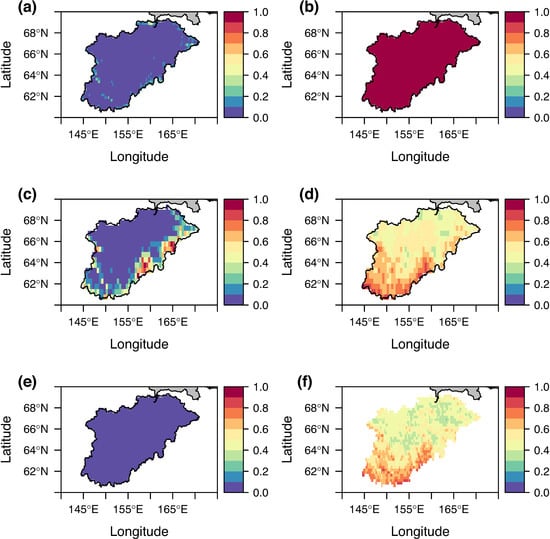In the Arctic River basins, the subsurface comprises continuous permafrost. Iijima et al. [] studied permafrost warming in eastern Siberia, deduced that it can abruptly increase the active layer thickness (ALT), and suggested that terrestrial hydrological changes can cause permafrost warming and degradation in continuous permafrost regions. However, despite recent advances in the subject, the impacts of permafrost distribution on the terrestrial water storage (TWS) and river runoff in large Arctic River basins have been poorly understood.