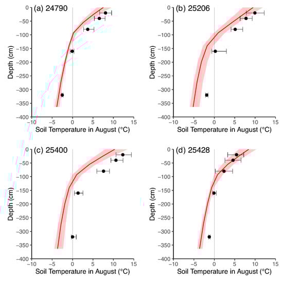 Vertical profiles of soil temperature climatology in August at four meteorological stations in the Kolyma River basin. Red lines and shaded area denote CHANGE simulation and 95% CIs, respectively. Black dots and error bars denote observed soil temperature and 95% CIs at meteorological stations, respectively. Site no: (a) 24,790, (b) 25,206, (c) 25,400, and (d) 25,428.