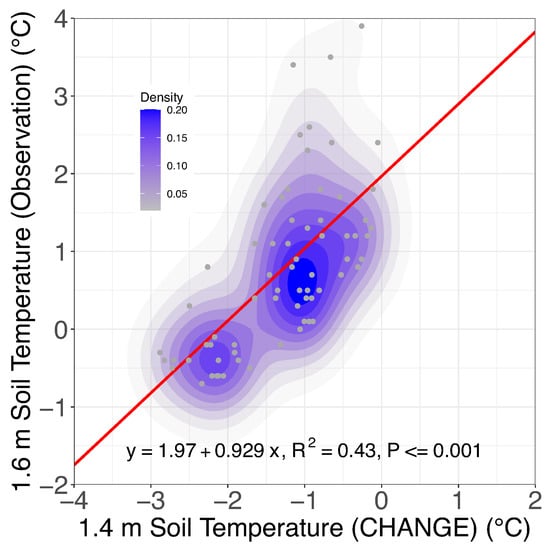 Comparison between observed 1.6 m depth soil temperature and CHANGE-based 1.4 m depth soil temperature in August at sites 24,790, 25,206, 25,400, and 25,428. Colors represent the density of gray circles. Red line denotes linear regression line, which is shown as an equation in the inset of the figure.