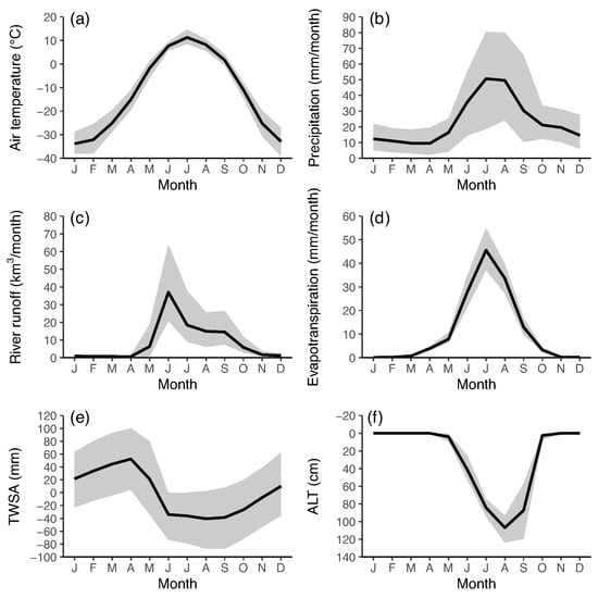 Basin-averaged climatology of the seasonal variations in monthly hydrometeorological factors: (a) Air temperature; (b) precipitation; (c) river runoff; (d) evapotranspiration; (e) terrestrial water storage anomaly (TWSA), and (f) active layer thickness (ALT); (d–f) are CHANGE-based products. Gray areas represent the interannual variability of 95% CIs.