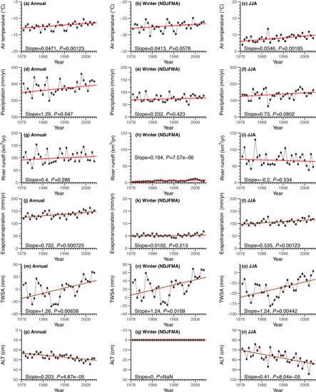 Figure 11j–l shows the annual, winter, and summer evapotranspiration over the basin. A significant increasing trend of evapotranspiration was observed annually and in summer; evapotranspiration was very small during winter and exhibited no significant trend. Except for winter, this increasing trend of evapotranspiration corresponded to the warming trend. TWSA of the Kolyma River basin was calculated using the estimated terrestrial water balance. With respect to the TWSA trend, the changes in the annual, winter, and summer averaged TWS for the basin are shown in Figure 11m–o; these figures show an evident increasing TWS trend, indicating that the water storage trend in the basin increased during the study period. The annual and summer averaged ALT exhibited an evident increasing trend (Figure 11p–r). The summer mean ALT increased approximately 15 cm during the study period, and the yearly average ALT increased 7 cm during the same period. Based on the above ALT trends, we can conclude that the upper parts of permafrost have shifted to the warming phase.