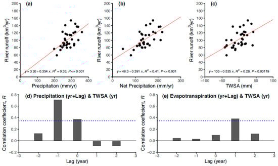 Relation between annual river runoff and related annual factors: (a) Precipitation, (b) Net precipitation (P-E), and (c) Terrestrial water storage anomaly (TWSA). Here, we used CHANGE-based evapotranspiration and TWSA; (d,e) Show lag correlation coefficients (R) between TWSA and precipitation and evapotranspiration, respectively. Lag year indicates precipitation and evapotranspiration against the target year of TWSA. Negative and positive lag denote that the lag year advanced and delayed from the target year of TWSA, respectively.