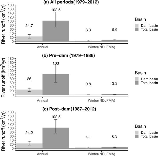 Herein, we discuss the impact of human activities such as dam regulation on winter discharge. Dams have major impacts on watershed storage and discharge regimes []. Majihi and Yang [] reported that the dam increased downstream flow during the low-flow season because reservoirs release water during the season. We also observed that the changes in winter streamflow of the Kolyma River basin were remarkable between the pre-dam and post-dam periods; however, we could not identify large changes in the summer and annual river runoffs for both periods. Therefore, we assumed that the increased winter river flow was primarily due to dam regulation as the observed increase in the winter river flow in the Kolyma River estuary was almost in correspondence with the increase in the winter river flow in the dam tributaries. The impact of the dam on the summer and annual flows is very small (Figure 13a–c) because the summer river flow in the Dam basin was almost the same during the pre-dam and post-dam period, and the annual flow from the whole basin was also the same during the post- and pre-dam period.