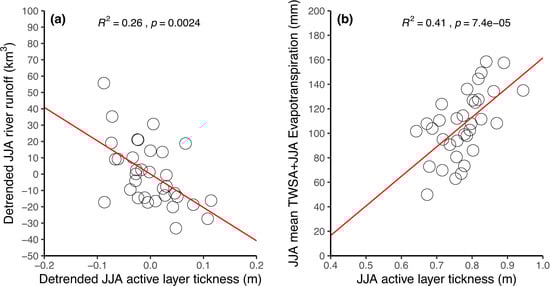 Relationship between (a) detrended June–August (JJA) river runoff and detrended JJA ALT and (b) Relationship between JJA TWSA and JJA evapotranspiration and JJA active layer thickness (ALT).